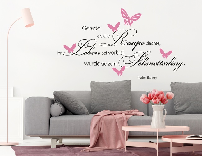 Den Prozess, von der Raupe zum Schmetterling, hat Peter Benary wunderbar poetisch und in nur einem Satz zu Papier gebracht. Beflügelt von diesem Zitat haben wir ein zauberhaftes Design kreiert, das Wandtattoo „Metamorphose“. Die fünf filigranen Schmetterlinge sind ein zusätzlicher Eyecatcher und bieten Dir die verschiedensten Kombinationsmöglichkeiten.