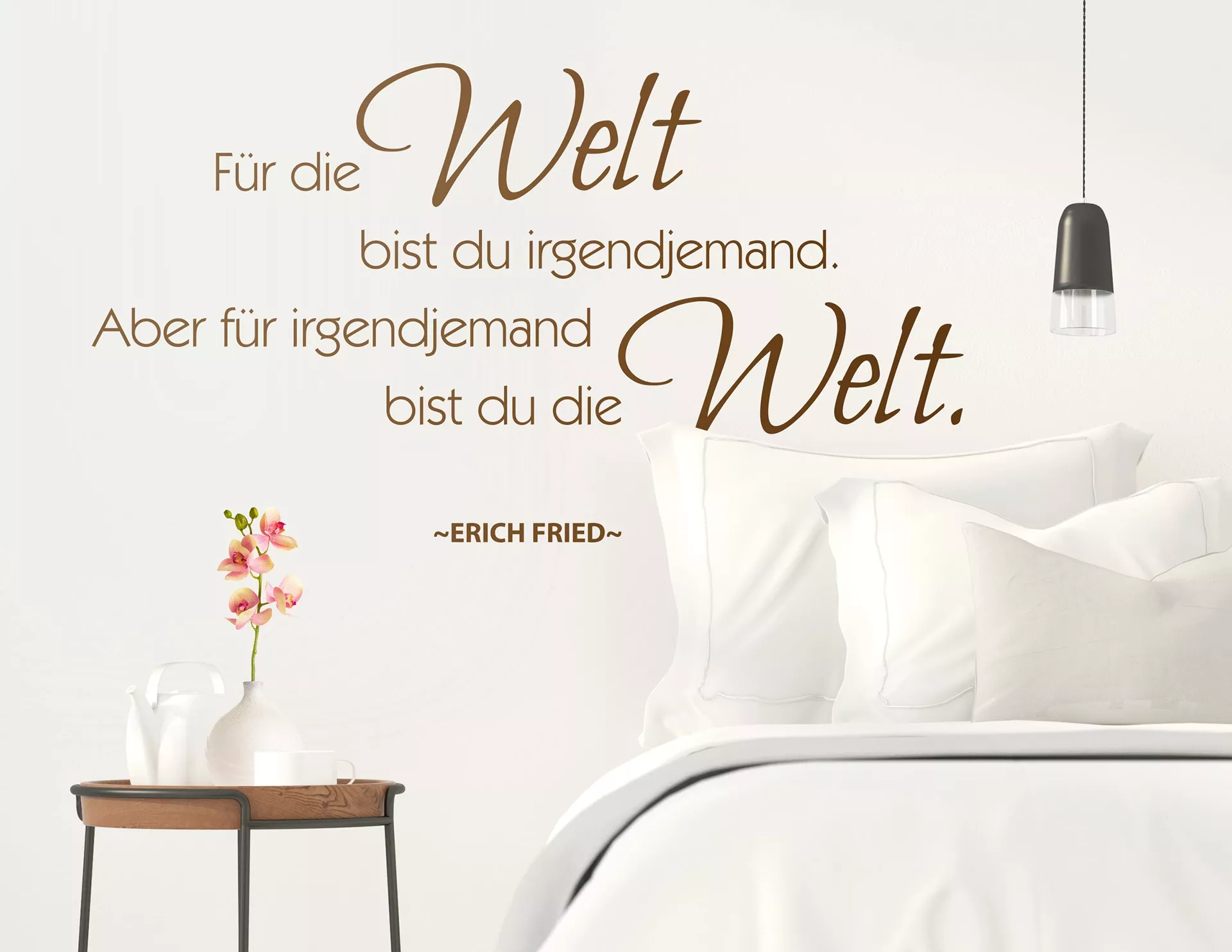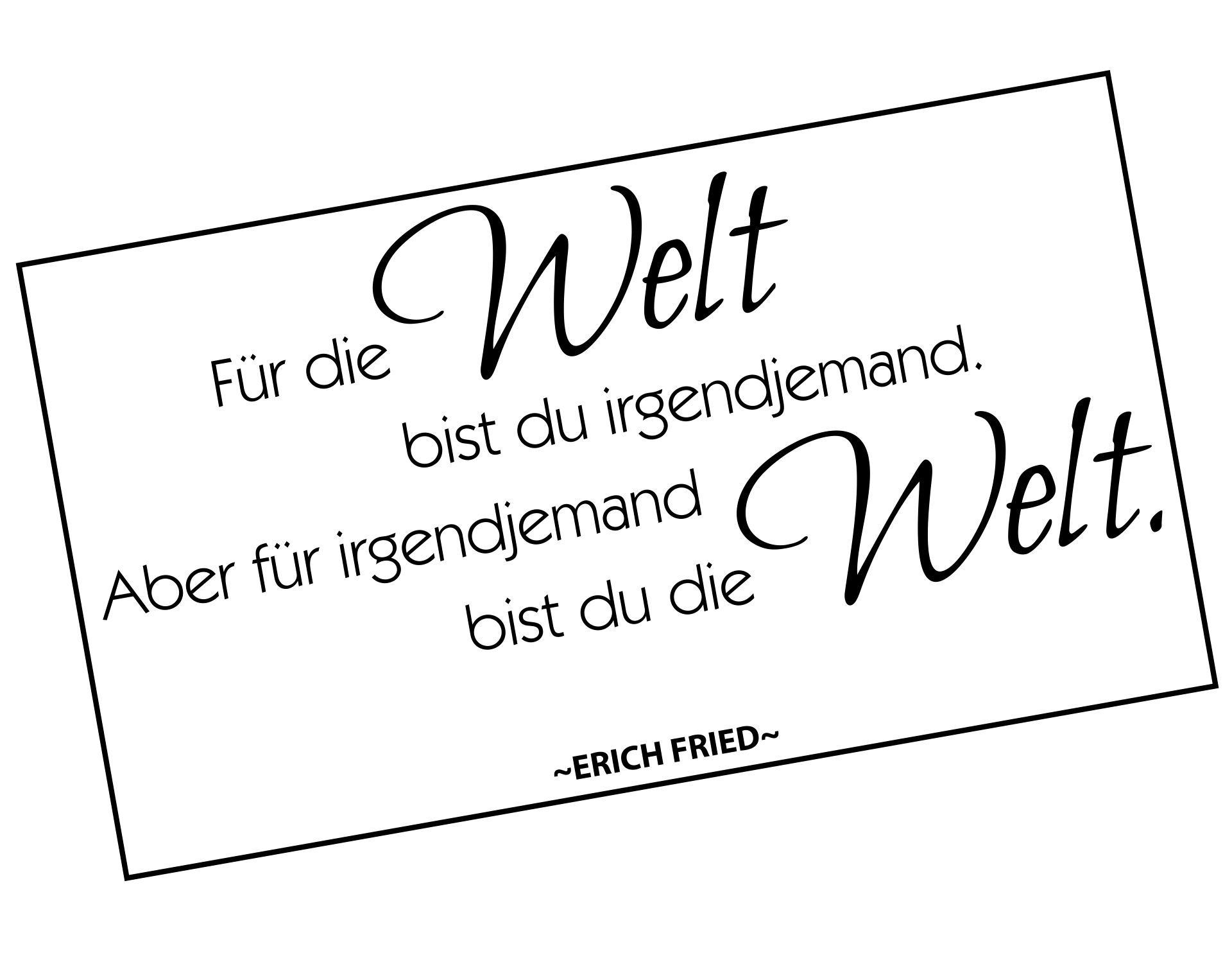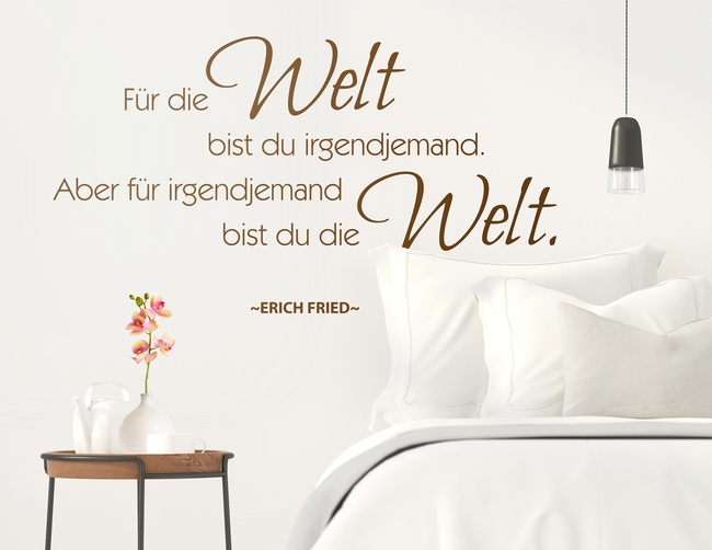 Dem Schatz mal wieder mit einer liebevollen Botschaft belohnen... Das wär doch was. Mit einem Wandtattoo gelingt Dir das jeden Tag. Erich Fried hätte es nicht besser formulieren können: „Für die Welt bist Du irgendjemand. Aber für irgendjemand bist Du die Welt.“ Eine Liebeserklärung, die für Gänsehautfeeling sorgt: Du bist einzigartig! Dich gibt es nur einmal für mich! Dein Liebling wird sich Tag für Tag geschmeichelt fühlen. Platziere das Wanddesign an einem Ort, der Dich an Deine schönsten Momente erinnert. So wird Deine Liebe immer präsent für Dich sein.