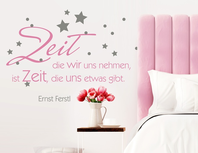 Viel zu selten nehmen wir uns Zeit, um uns den wirklich wichtigen Dingen des Lebens zu widmen: der Liebe, der Familie, den eigenen Interessen. Das Zitat von Ernst Ferstl „Zeit die wir uns nehmen, ist Zeit, die uns etwas gibt“ weckt täglich die Erinnerung daran, auch mal zur Ruhe zu kommen, die Arbeit sein zu lassen und uns den wahren Prioritäten des Lebens zu widmen. Mit den schönen Sternchen, die das Wandtattoo umrunden, kommt die tiefsinnige Bedeutung der Aussage erst richtig zur Geltung. Gleichzeitig verschönert das Design Dein Zuhause mit einer wunderbaren Botschaft, die garantiert ankommt.