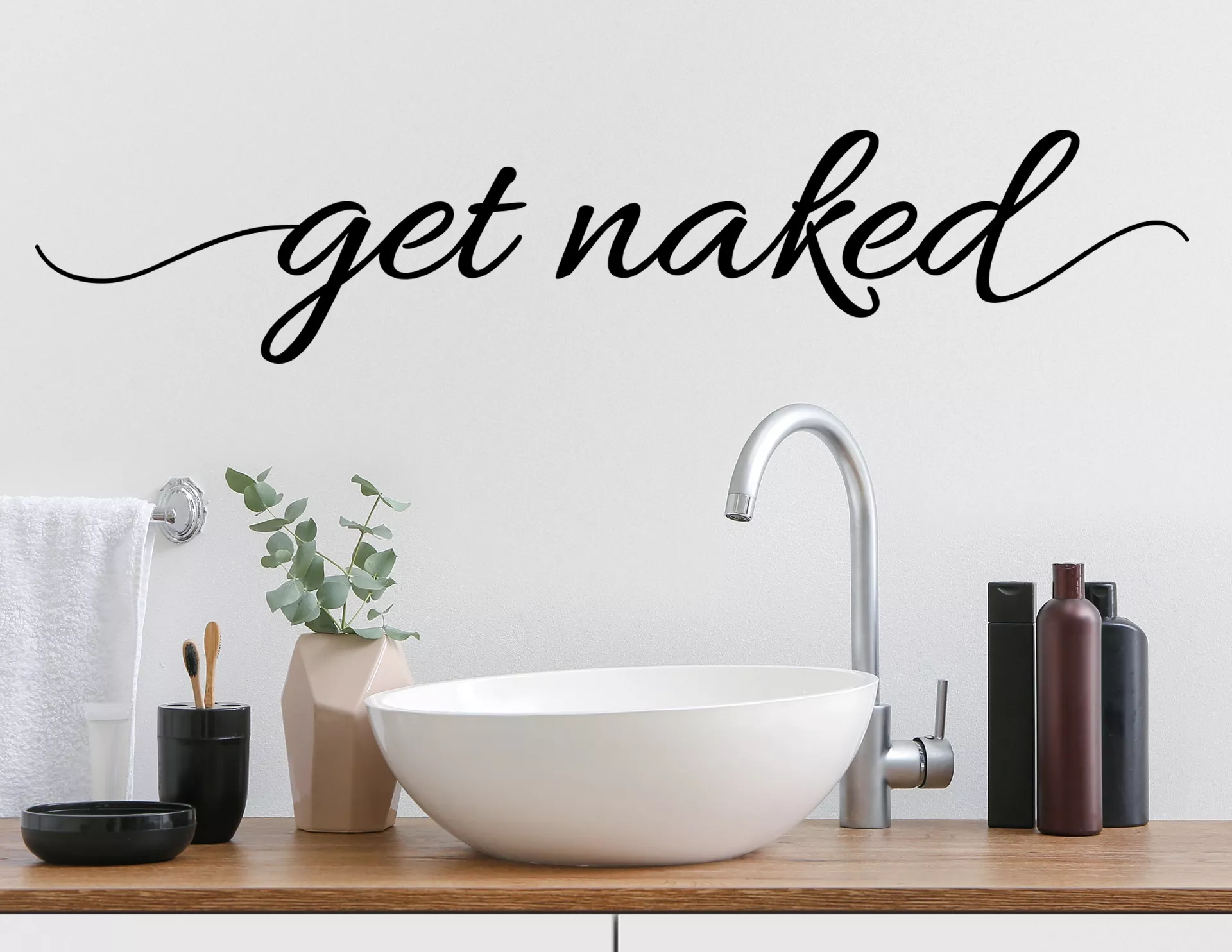 Das Wandtattoo „Get naked“ in englischer Sprache ist eine witzige Innenraumdekoration z.B. für das Badezimmer. Verschönere mit diesem genialen Blickfang Deine Wände und mach ihn zum Highlight in Deinem Heim.