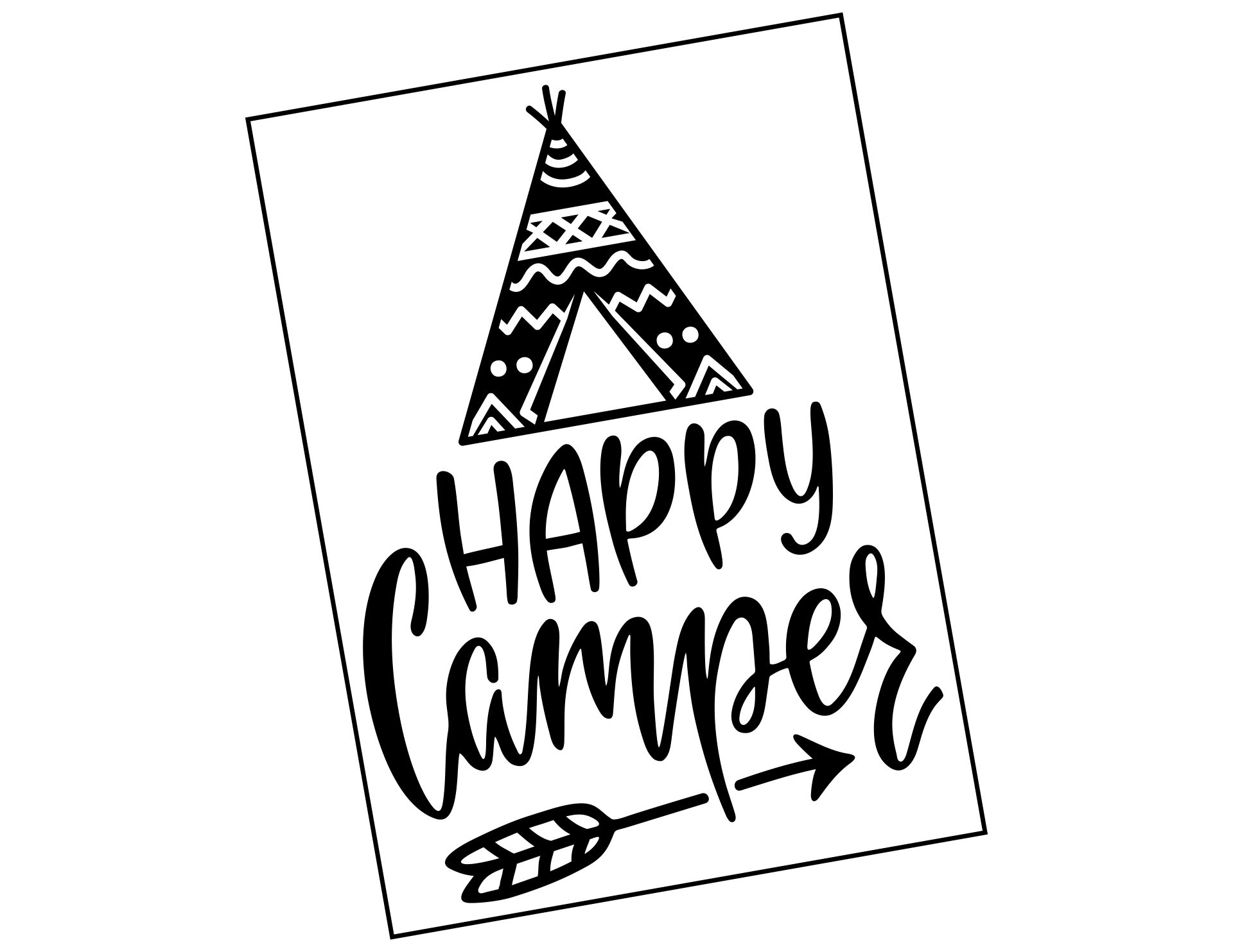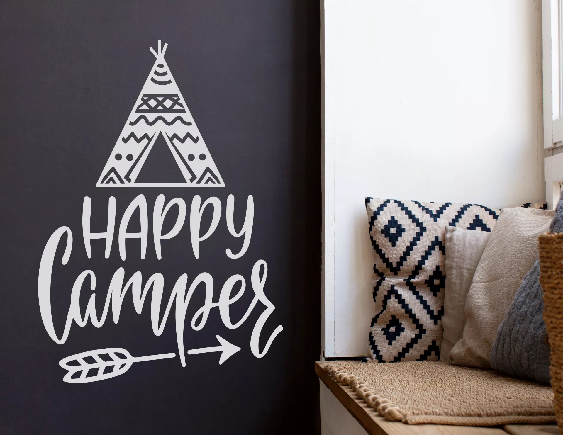 Einschlafen zum Zirpen der Grillen, zum Quaken der Frösche und eins sein mit der Natur: Nicht nur Stadtmenschen entdecken die nachhaltige Entspannung des Campings wieder. Wandtattoo "Happy Camper": Ein kreatives Design mit einem Schriftzug im Handlettering-Stil samt Tipi-Zelt und Pfeil.