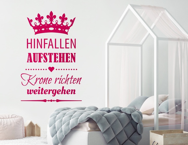 Eine klare Botschaft: „Hinfallen – Aufstehen – Krone richten – weitergehen!“ So gehen echte Prinzessinnen, Königinnen und Queens mit Rückschlägen oder Steinen im Weg um. Lass Dich also nicht unterkriegen, egal was passiert. Mit dem Statement dieses schönen Wandtattoos kannst Du voller Stärke und Mut den Alltag bestreiten, denn keine Widrigkeit kann Dich aufhalten! Unser majestätische Wandtattoo überzeugt nicht nur mit Inhalt, sondern auch vielen kleinen Details: Verschiedene Schriften, eine große Krone und Trennlinien aus Punkten, Herzen und Pfeilen, die Du Deinen eigenen Wünschen entsprechend anordnen kannst. So wird jedes Zimmer in Deiner Wohnung zu einem echten Märchenschloss!