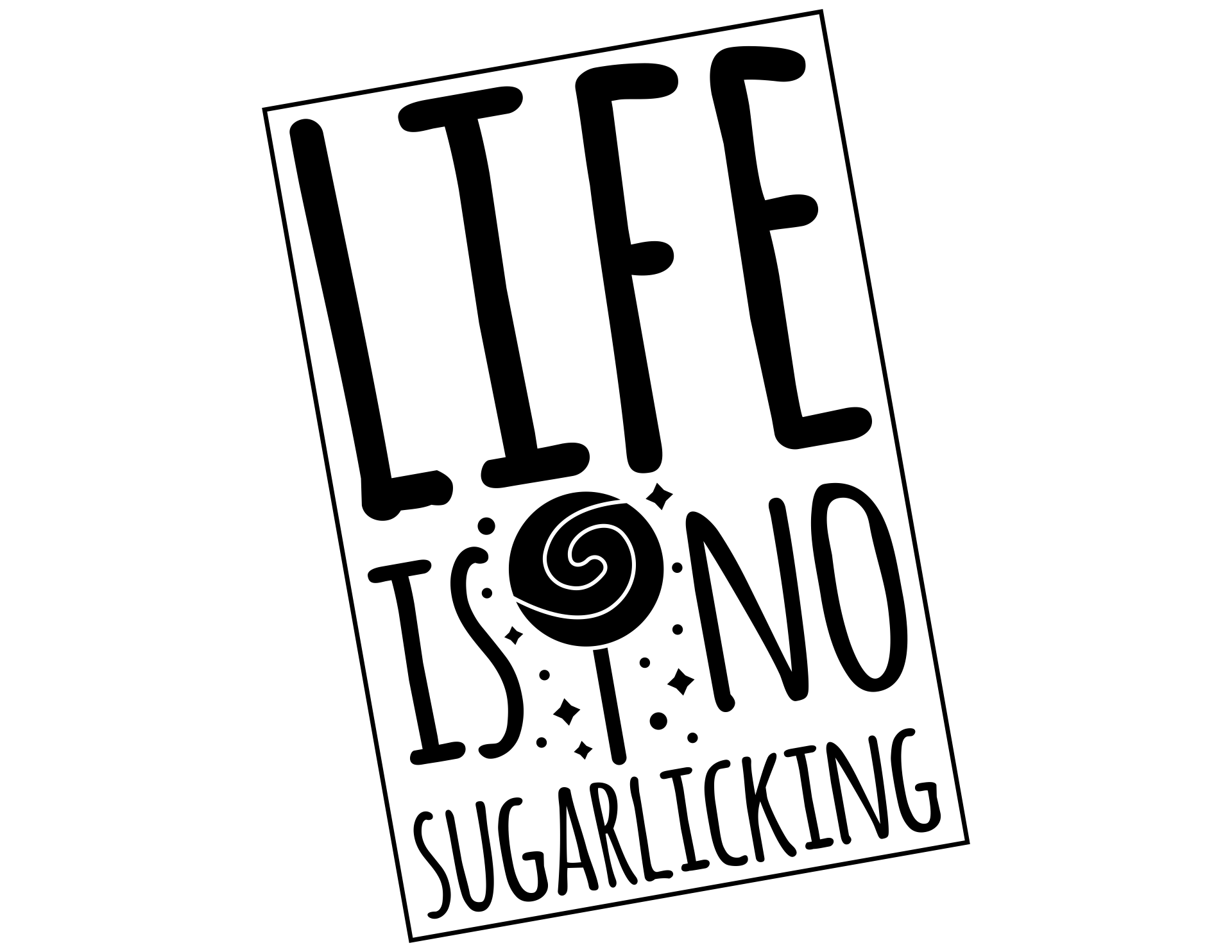 Große Weisheit, süß verpackt: "Life is no sugarlicking" ist eine witzige Variante des Sprichworts ‚Das Leben ist kein Zuckerschlecken‘ – hier im schönsten Denglisch samt Lollipop und Zuckerschock.