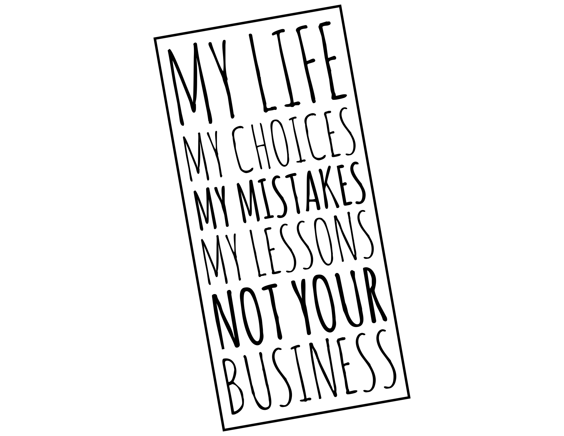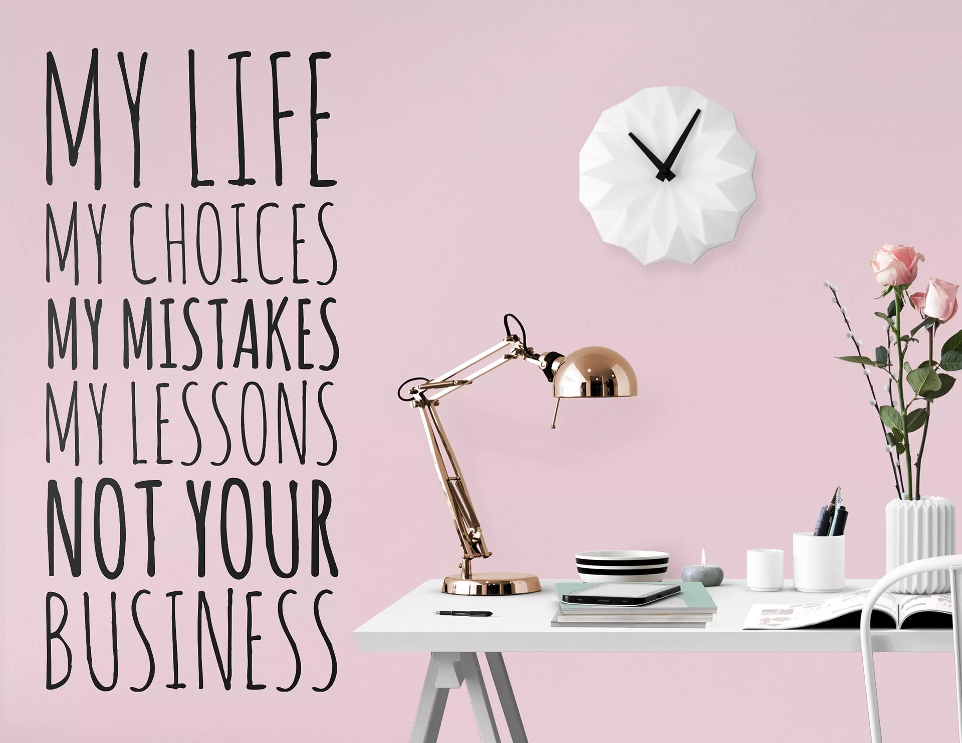 Unser Wandtattoo „My Life“ steht für Selbstbewusstsein, Mut und Stärke. Der Spruch „My Life, my choices, my mistakes, my lessons, not your business“ bedeutet übersetzt: „Mein Leben, meine Entscheidungen, meine Fehler, meine Lektionen, das geht Dich nichts an.“ Jedem Betrachter wird sofort klar, dass Du stark genug bist, Dein Leben selbst in die Hand zu nehmen. Das Wandtattoo hat also eine klare Message: Halt Dich aus meinem Leben raus! Für selbstbewusste Frauen und starke Männer ist dies das perfekte Wandtattoo, das sich zusätzlich durch eine außergewöhnliche Schriftart mit tollen Akzenten von der Wand abhebt.