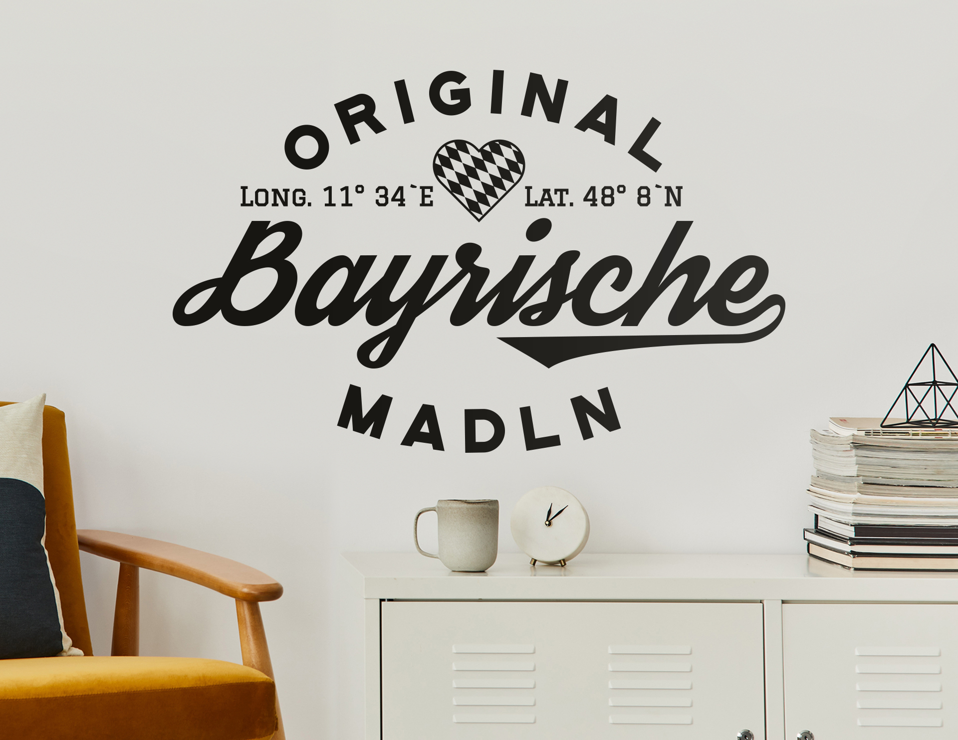 Wandtattoo Original Bayrische Madln: Ein liebevoll gestaltetes Design mit viel Herz für Bayern und den Koordinaten Münchens.