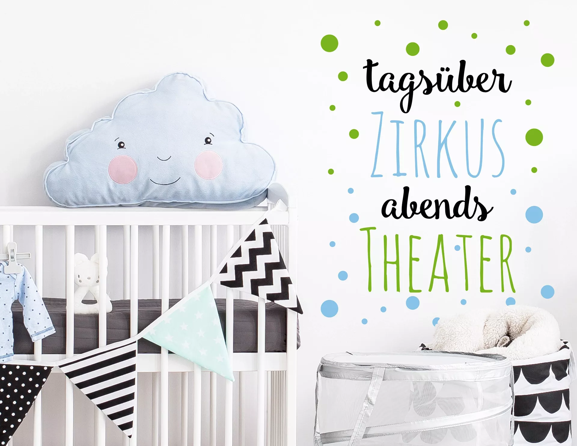 Das Wandtattoo „Theaterzirkus“ beschreibt den typischen Alltag aller Eltern: Tagsüber machen die Lieblinge Zirkus, abends geht das Theater los. Mit unserem süßen Design an der Wand wird das tägliche zu Bett bringen zu einem echten Vergnügen. Und wenn es dann doch zum Theater kommt, zaubert es zumindest ein Lächeln auf die Lippen. Die niedliche Schriftart wird von tollen Punkten abgerundet, die dem Wandtattoo ein verspieltes Design verleihen. So wird der Raum von einer Wärme erfüllt, die auch den kleinen Liebling begeistert.