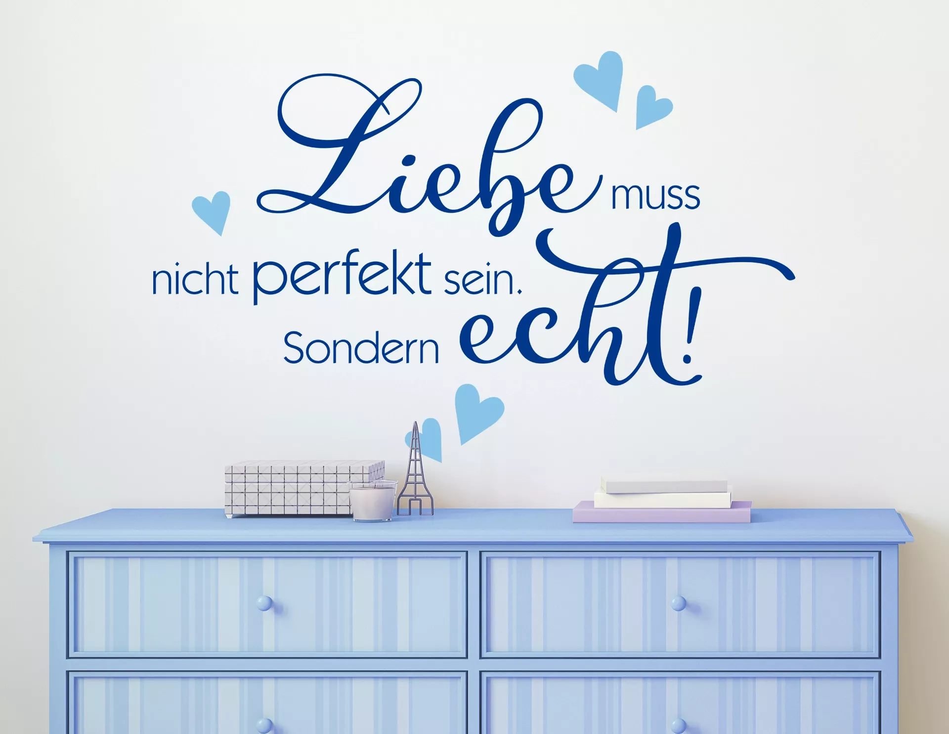 Wer einen Hauch Romantik an der Wand vermisst, der ist mit diesem kreativen Text-Design bestens beraten. Die Botschaft sticht direkt ins Herz, denn: 'Liebe muss nicht perfekt sein. Sondern echt!' Und was bedeutet das? Gemeinsam den Alltag zu bestehen, zusammen in eine Richtung zu schauen, Vertrauen zu schenken und einfach glücklich zu sein. Unser Motiv-Aufkleber bringt es auf den Punkt und zeigt, wie zauberhaft das Schönste aller Gefühle sein kann. Eine Hommage an die Liebe – Wandtattoo "Echte Liebe" mit fein kalligraphierten Buchstaben im Handlettering-Stil und fünf niedlichen Herzen drumherum.