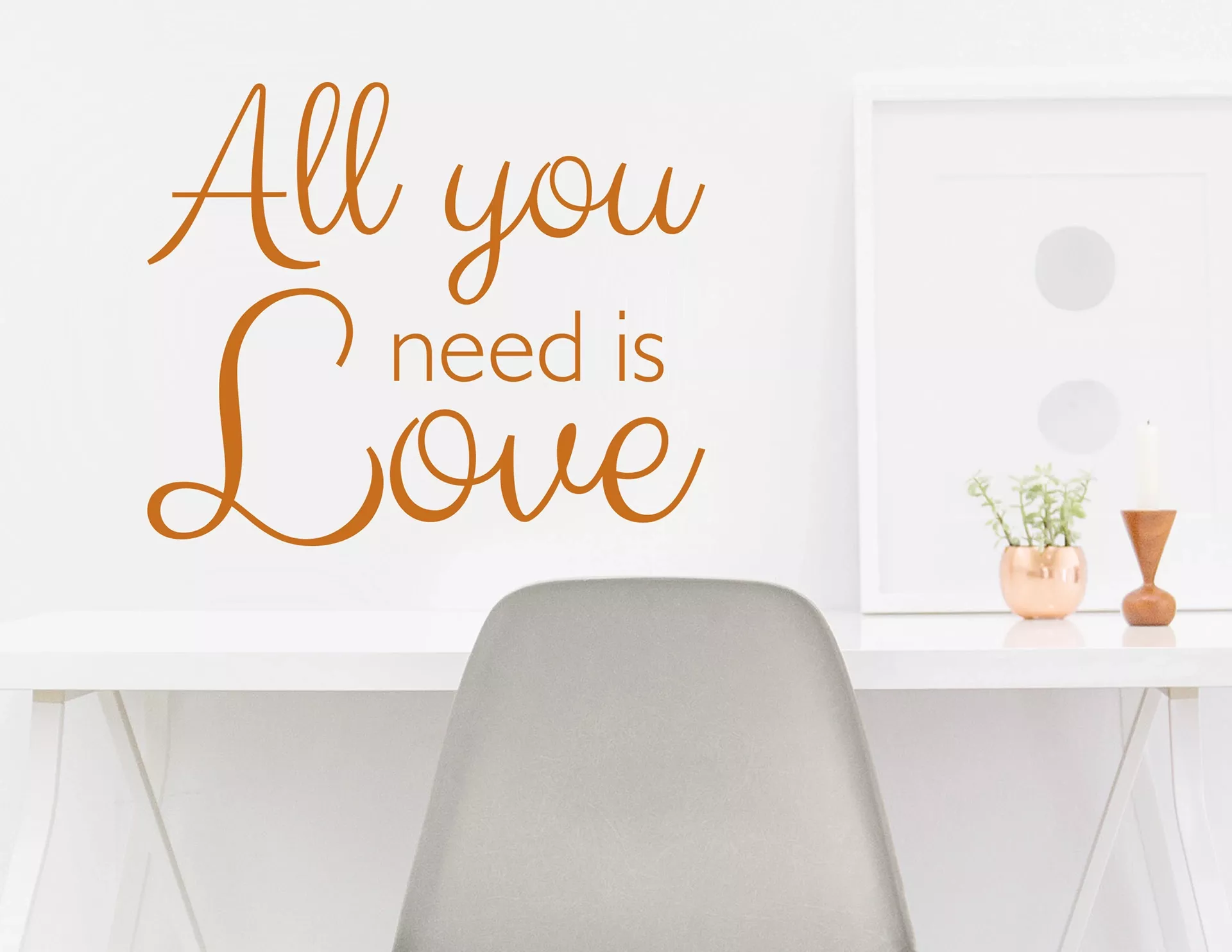 Amors Pfeil hat Dich getroffen? Die Schmetterlinge fliegen und Du könntest die ganze Welt umarmen? Dann könnte dieses schöne Wandtattoo perfekt zu Dir passen. Mit diesem Schriftzug an der Wand wirst Du in Nullkommanix zum Liebesbotschafter! Nutze Deinen ungebremsten Tatendrang und verleihe Deiner Wohnung ein tolles Lifting mit diesem exklusiven Wandtattoo. Erschaffe Dir so eine Inneneinrichtung mit Ambiente und Atmosphäre! Der Schriftzug „All you need is Love“ ist ein echtes Highlight und verströmt Liebe in den eigenen vier Wänden. Die buchstäbliche Love Message wertet jeden Wohnbereich auf und sorgt für eleganten Glanz in allen Räumlichkeiten. Das extravagante Wanddesign macht in der Küche genauso wie im Wohnzimmer oder Schlafzimmer eine gute Figur.