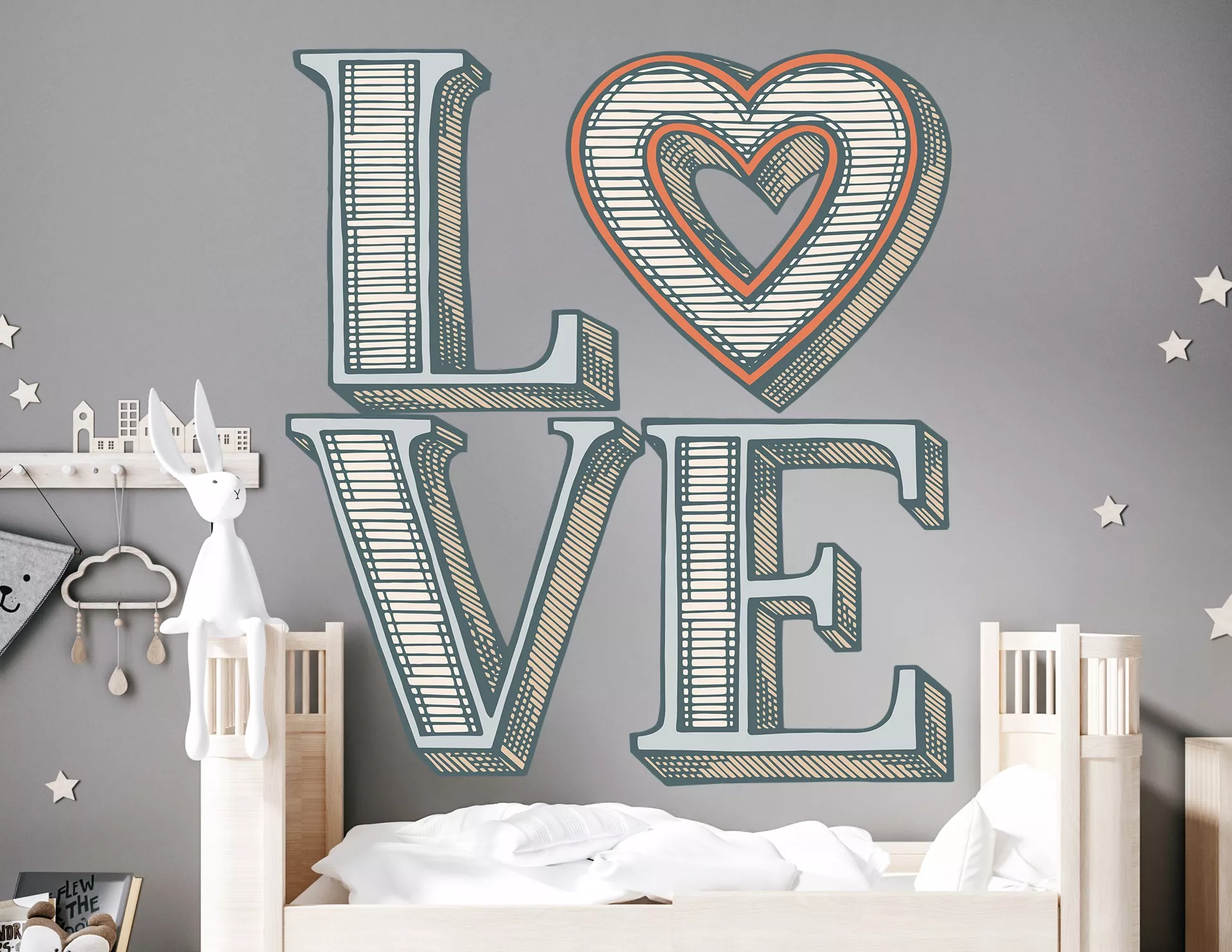 Große Gefühle: Mit unseren LOVE-Buchstaben im Vintage-Look samt Herz kannst Du überall dort Deine Liebe zeigen, wo sie für jedermann sichtbar sein soll. Über dem Bett im Schlafzimmer, im Kinderzimmer, zur Begrüßung im Korridor, im Bad... dieses Design passt einfach überall hin – auch ohne viele Worte, unser Wandtattoo "Love in Letters"!