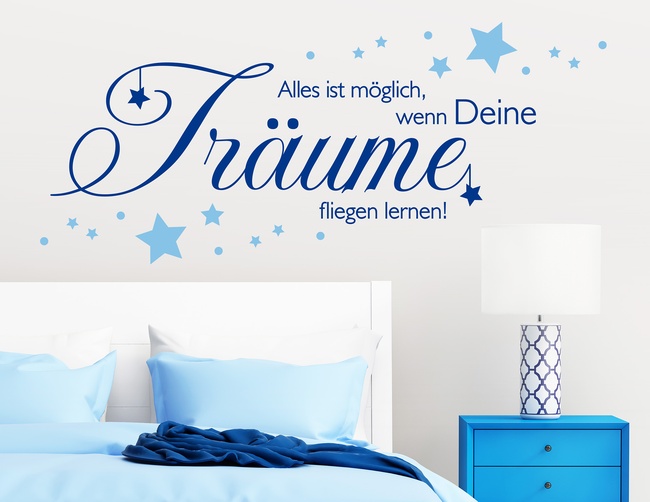 „Alles ist möglich, wenn Deine Träume fliegen lernen!“ Dieses Wanddesign erinnert Dich daran, Deine Träume zu erkennen und an das Unmögliche zu glauben. Denn Grenzen entstehen bekanntermaßen zuallererst in unserem Kopf. Dabei helfen uns Träume dabei, den ersten Schritt ins Unbekannte zu wagen und unser Wunschleben zu manifestieren. Ein Grund mehr sich täglich vor Augen zu führen, wie wichtig träumen ist. Das Wandtattoo „Alles ist möglich...“ sorgt für die tägliche Dosis Inspiration und Motivation an Deiner Wand! Der Schriftzug besteht aus einem Set mit vielen großen und kleinen Sternen, die Du individuell an der Wand anbringen kannst.