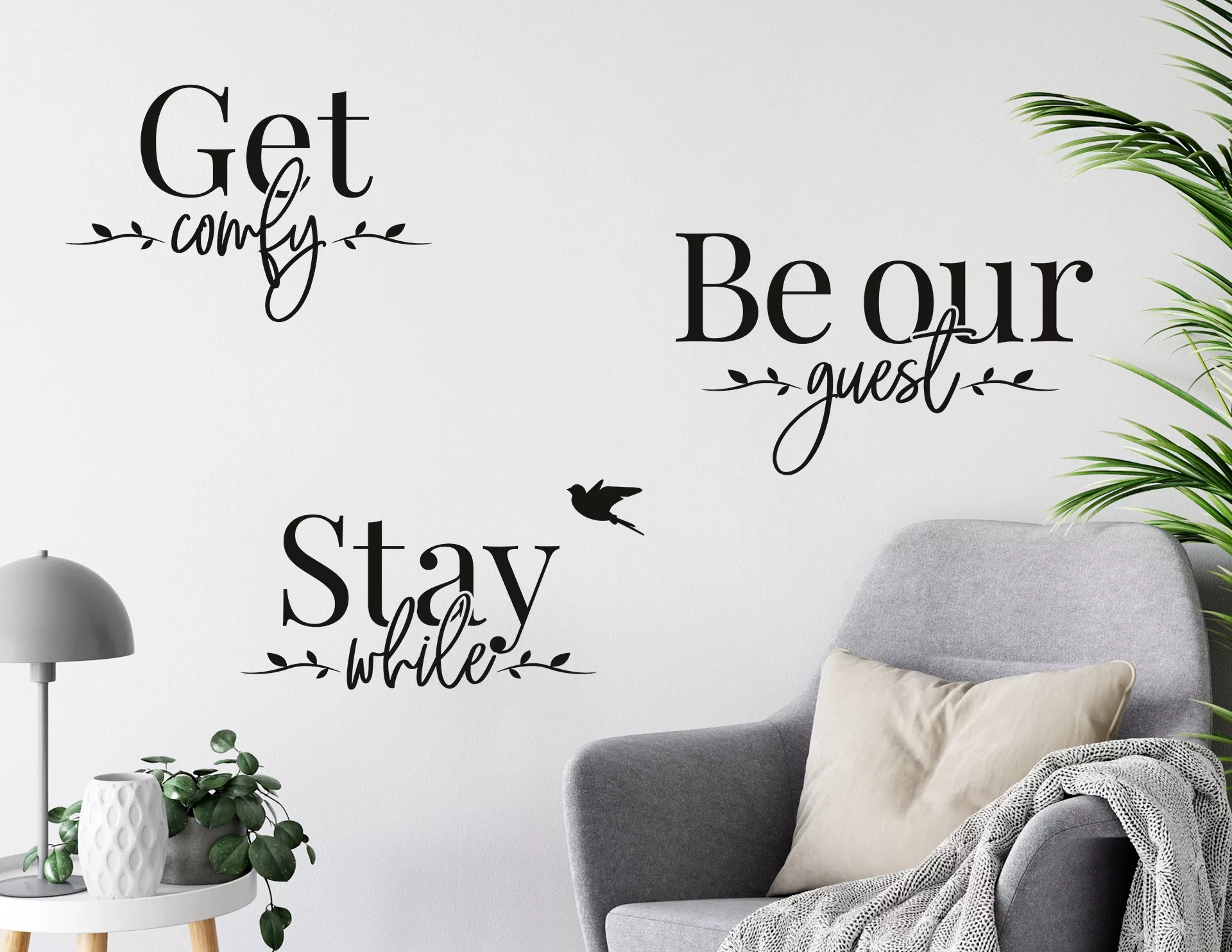 Du hast nur kleine Flächen an Deinen Wänden übrig? Halb so schlimm, denn wir haben die Lösung! Unser kreatives Wandtattoo "Be our guest" besteht aus drei Teilen, ermöglicht viel Gestaltungsfreiheit in Puncto Wandveredelung und Dank unseres ausgeklügelten Designs, kommen von nun an selbst die kleinsten Ecken richtig zur Geltung. – Ein charmanter Text-Aufkleber mit klassisch geraden und fein kalligraphierten Buchstaben samt filigraner Ranken und einem kleinen Vogel. „Get comfy, stay a while, be our guest” heißt zu deutsch: “Mach’s Dir gemütlich, bleib ein Weilchen und sei unser Gast” …kann man schönere Worte finden um Familie und Freunde willkommen zu heißen? DIY-Idee: Die Textgruppen können mit einer Schere vom Spruchbogen getrennt werden und sind frei an der Wand platzierbar.