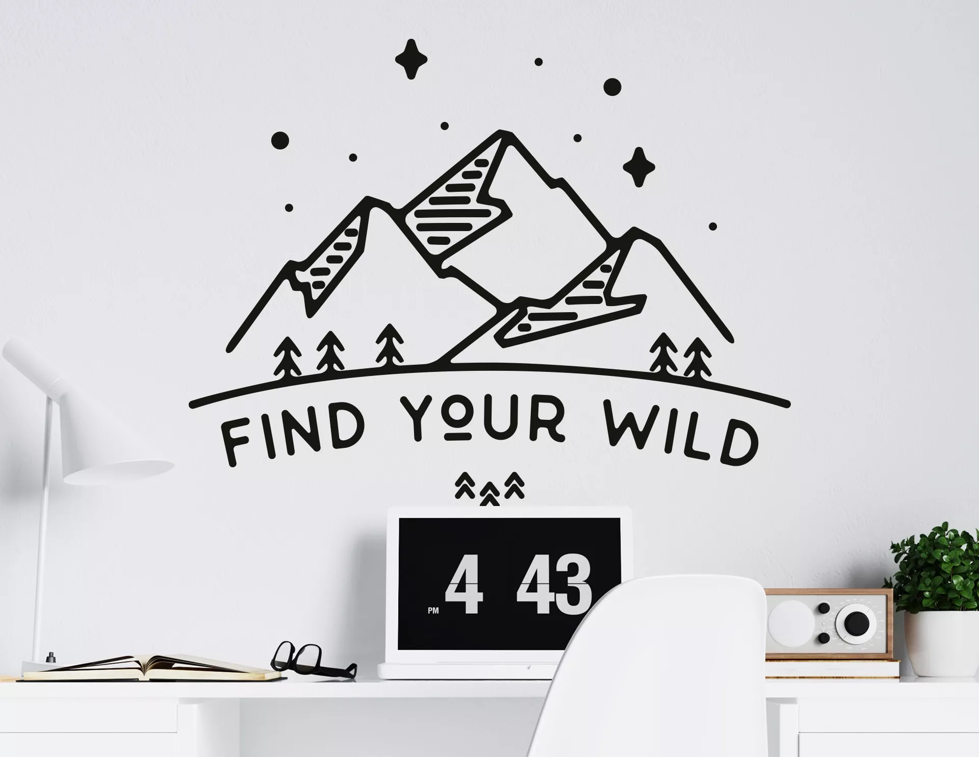 Der Begriff 'Find Your Wild' bedeutet so viel, wie die innere Bestimmung zu finden. Jeder Mensch hat Sehnsüchte – sich selbst darauf einzulassen und der Passion nachzugehen, ist hiermit gemeint. Unser Design-Aufkleber mit Wald und Bergwelt, Sternen und Punkten, illustriert in feinen Linien, passt perfekt in dieses Bild. Denn für viele Menschen gehört eine natürliche Umgebung dazu, um das Leben lebenswert zu machen. Somit ist das Wandtattoo "Find Your Wild" gerade – aber nicht nur – für Naturenthusiasten bestens geeignet.