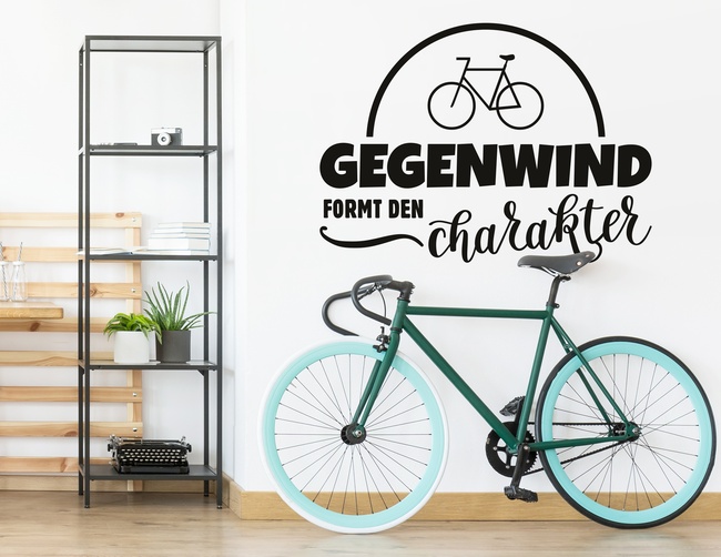 Gegenwind formt den Charakter! Getreu nach diesem Motto haben wir das Wandtattoo "Gegenwind" gestaltet. Ein sportliches Design, das mit geraden Schriften, Deko-Elementen und Handlettering überzeugt. Viele von uns nutzen regelmäßig das Fahrrad: für Sport, Einkäufe, den Weg zu Arbeit – oder einfach nur aus Freude an der Bewegung auf zwei Rädern. Doch im Straßenverkehr ist stets Rücksichtnahme und wahrer Charakter geboten, damit es nicht zu brenzligen Situationen zwischen Fahrrädern und Kraftfahrzeugen kommt. Wir wünschen allzeit gute Fahrt!