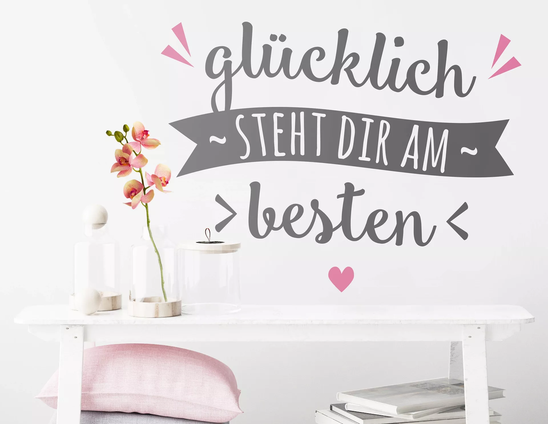 Ein Wandtattoo, das Komplimente macht. Das Wanddesign „Glücklich steht Dir“ tut was für Dein Charisma und trainiert die Mundwinkel.