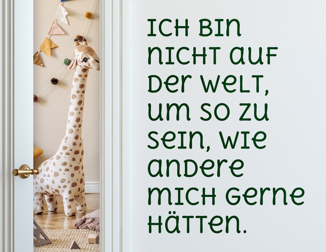 "Ich bin nicht auf der Welt, um zu sein, wie andere mich gerne hätten". Dieses Text-Design soll daran erinnern, mehr Zeit für sich und in die eigene Selbstsorge zu investieren. Individuell zu sein, sich wohlzufühlen mit dem eigenen Leben und so akzeptiert zu werden, ist wichtig. Darauf spielt unser Wandtattoo an, dass als typographischer Reminder perfekt in den Flur oder das Kinderzimmer passt.