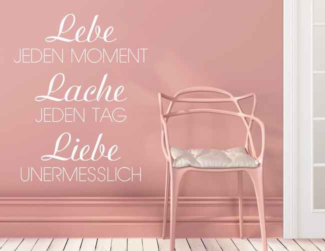 Das schöne Wandtattoo „Lebe, Lache, Liebe“ erinnert jeden Morgen an die eigene, innere Kraft und verleiht dem Raum ein unverwechselbares Ambiente.