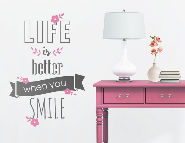 „Life is better when you smile.“ Unser schönes Wandtattoo bringt diese Botschaft gekonnt in die eigenen vier Wände und erinnert jeden Tag aufs Neue daran, wie kostbar das eigene Lächeln ist. Die verschiedenen Schriftarten und die schönen Blumenapplikationen schaffen ein einmaliges Ambiente, das zum Verweilen einlädt und jedem Betrachter ein Lächeln ins Gesicht zaubert. Mit diesem Wandtattoo verlässt Du jeden Tag lächelnd das Haus und machst nicht nur Dir, sondern auch all Deinen Mitmenschen eine Freude! Denn jeder weiß: ein Strahlen im Gesicht sorgt für Optimismus und Erfolg!