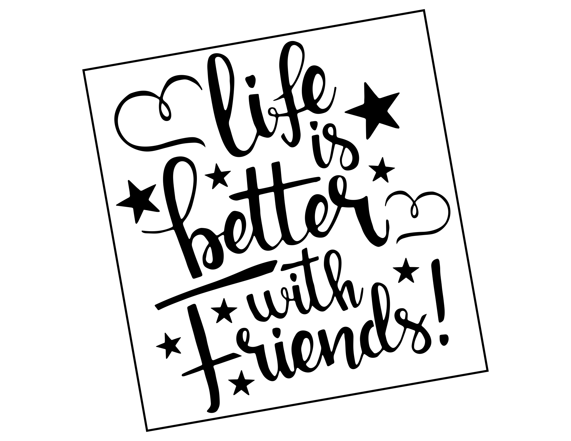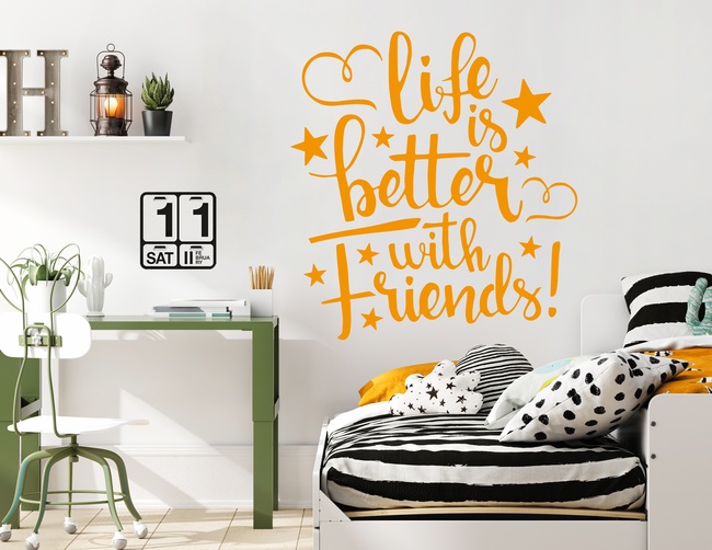 Gute Freunde begleiten uns durch dick und dünn, hören zu, kritisieren, motivieren und ermutigen uns, immer auf eine faire Weise. Wandtattoo "Life is better with Friends" (dt. Das Leben ist besser mit Freunden): Ein kreatives Design für die Wand, mit einem geschwungenen Schriftzug im Lettering-Stil, zwei Herzen und sieben Sternen.