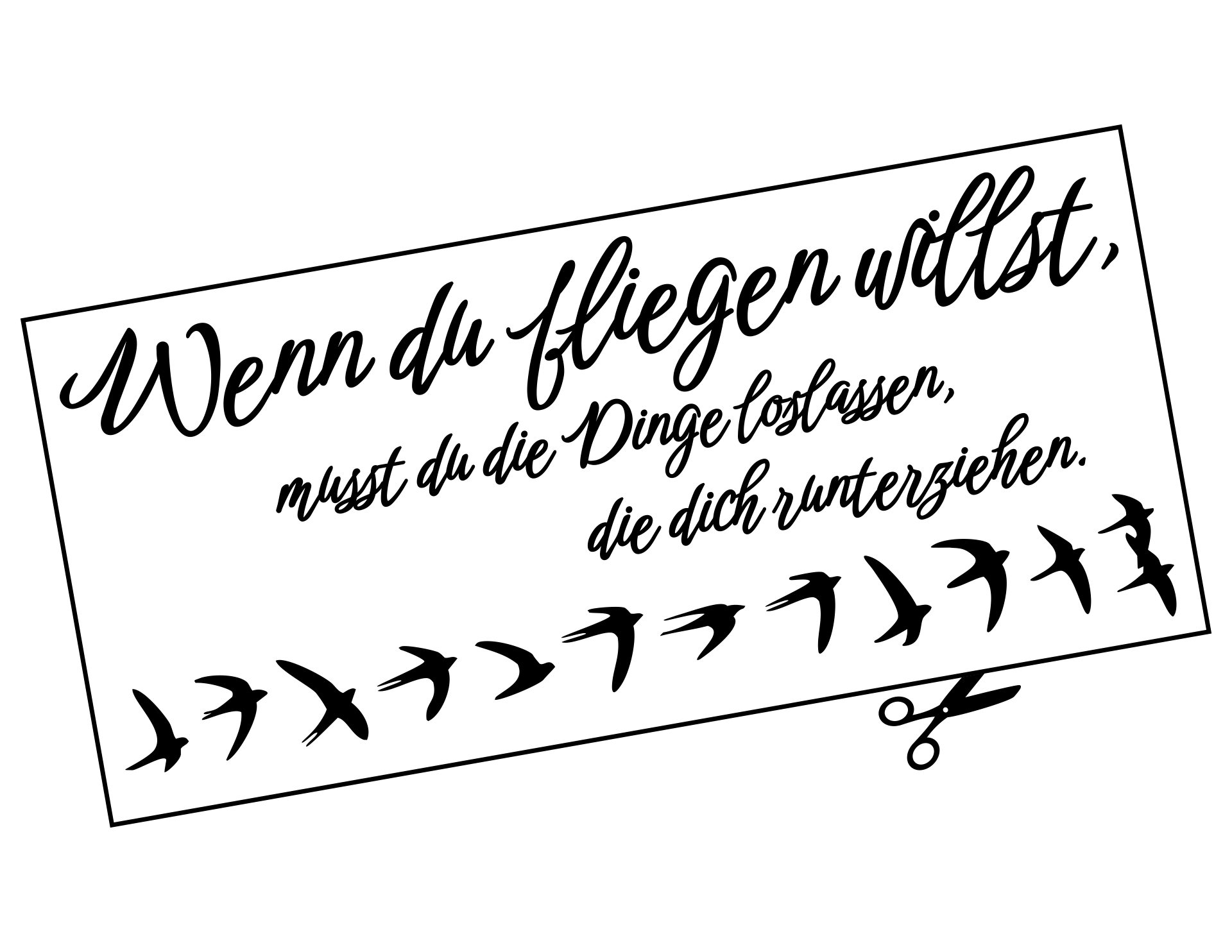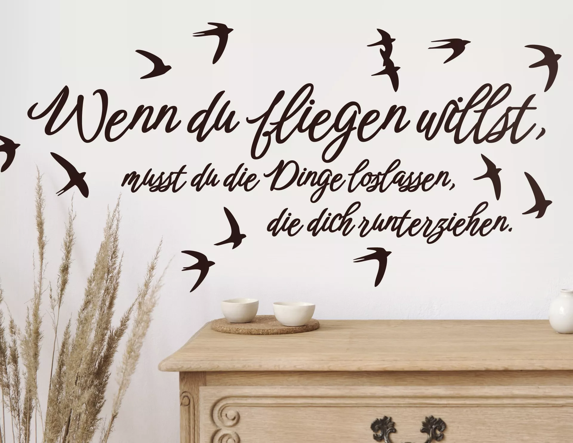 Beflügelnde Sprüche für die Motivation gibt es viele. Einer der schönsten ist dieser: "Wenn Du fliegen willst, musst Du die Dinge loslassen, die Dich runterziehen." Dieses Motiv kannst Du gut sichtbar bei Dir zuhause ankleben, denn als DIY-Wandtattoo sorgt der Spruch nicht nur für den richtigen Motivationskick, sondern sieht mit den begleitenden Schwalben einfach dekorativ aus. Und vielleicht wird das Leben demnächst tatsächlich etwas leichter – bis man leicht genug für's Fliegen ist…