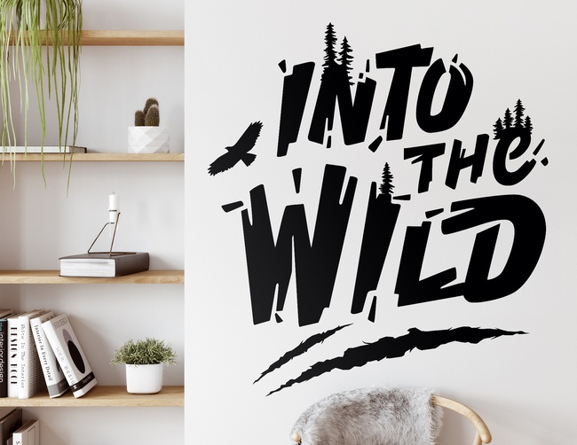 Höchste Zeit, die Seele baumeln zu lassen! Wo könnte das besser gelingen als in der Wildnis? Wandtattoo "Into the Wild": Ein Typografie-Design, welches pures Urlaubsfeeling versprüht, für echte Natur-Fans mit Bärenkrallen-Kratzern, Bäumen, Adler und Spruch.