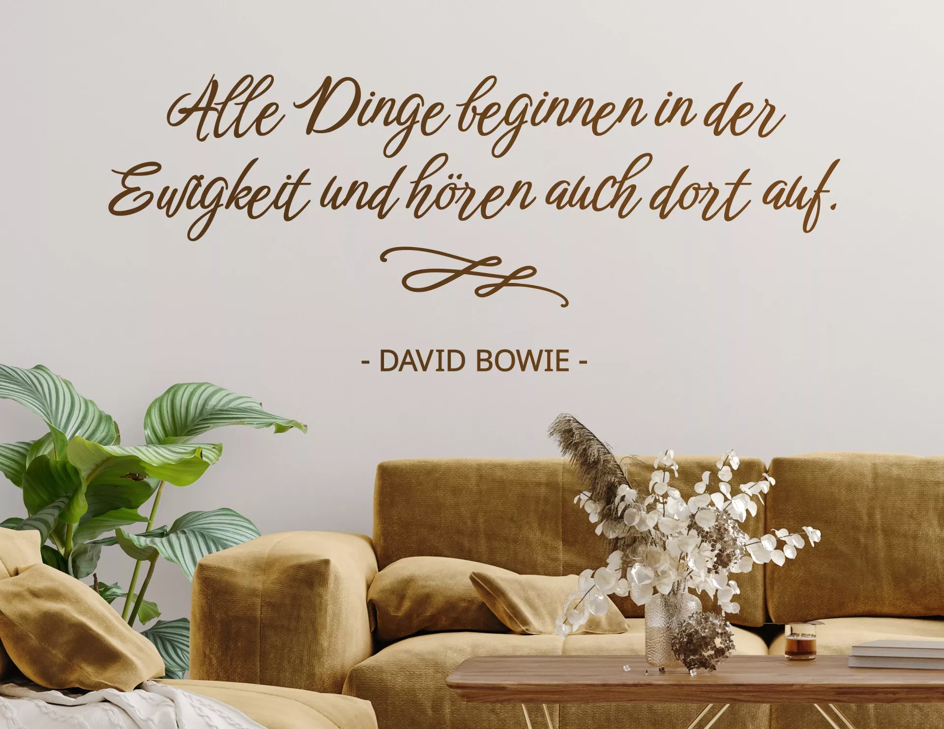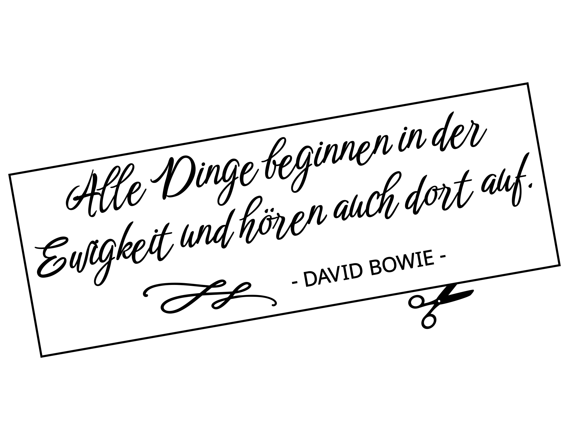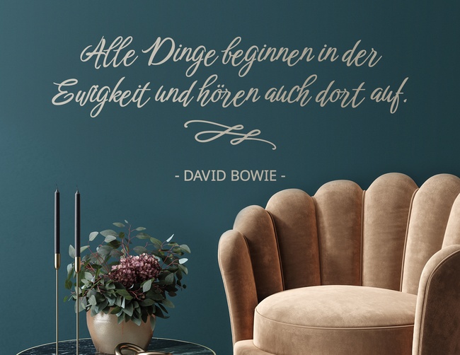 Er war Major Tom, Ziggy Stardust und der Mann, der vom Himmel fiel: David Bowie. Der britische Musiker mit den markanten Augen erfand sich in jedem Jahrzehnt neu und bewirkte damit, ewiglich jung und modern zu klingen. Vielleicht lag es an seinem Credo, das wir hier zu einem Wandspruch verwandelt haben: "Alle Dinge beginnen in der Ewigkeit und hören auch dort auf." Wer dieses tiefsinnige Bowie-Zitat zuhause haben möchte, kann mit dem DIY-Wandtattoo ab sofort seine Wände dekorieren.