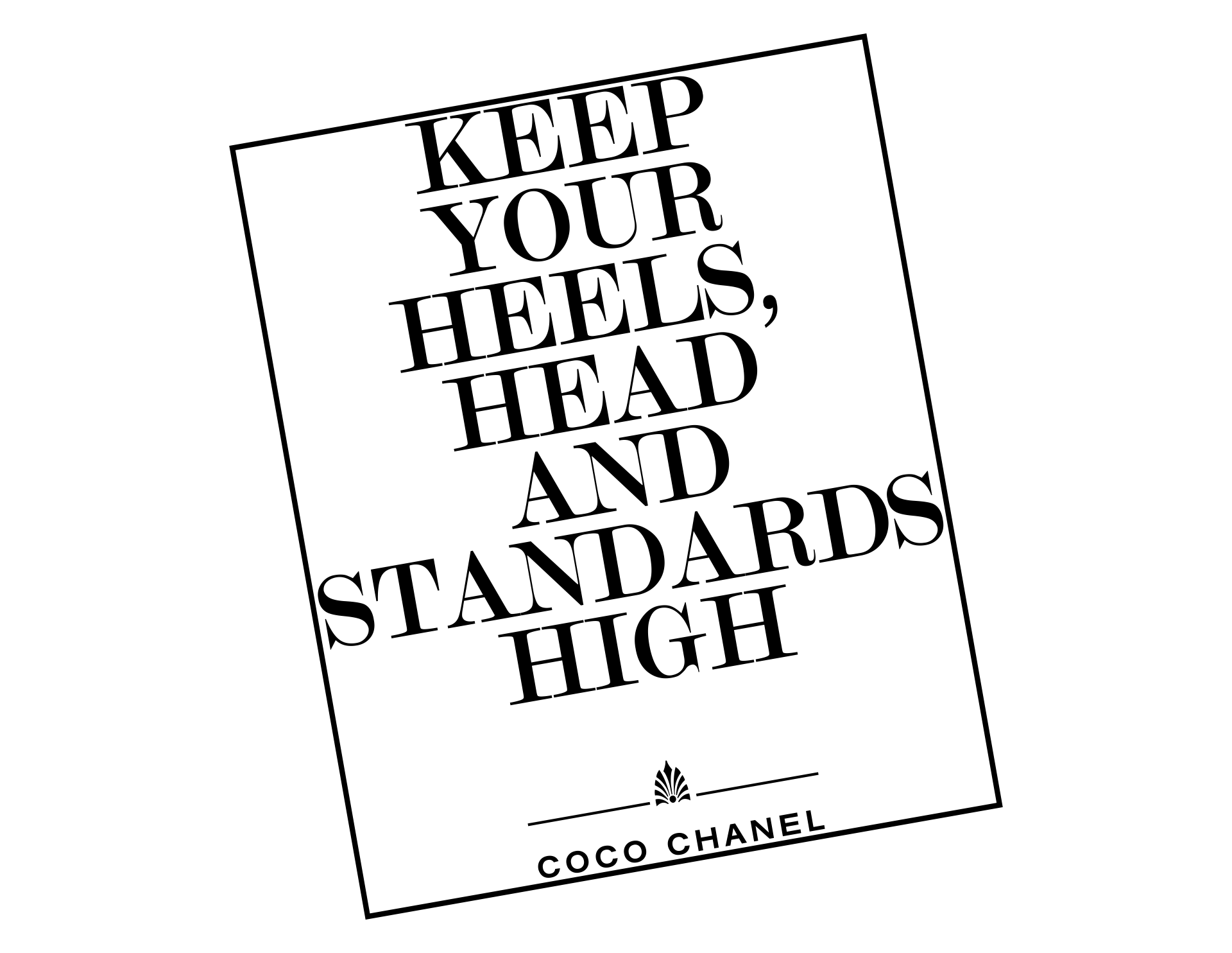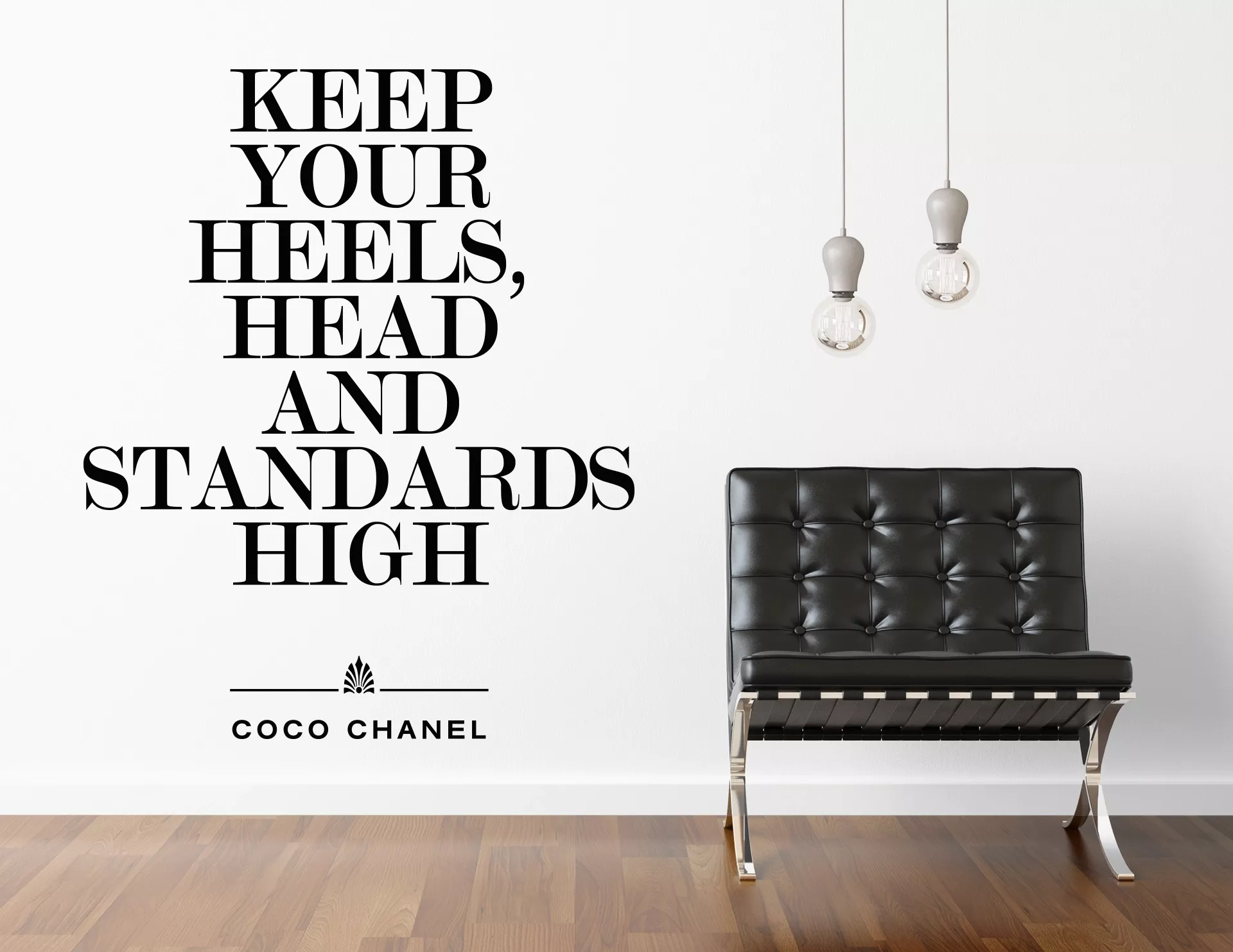 "Keep your Heels, Head und Standards high". So elegant wie das kleine Schwarze, nur für die Wand: Das Design "High Standards" mit einem Zitat von Coco Chanel.