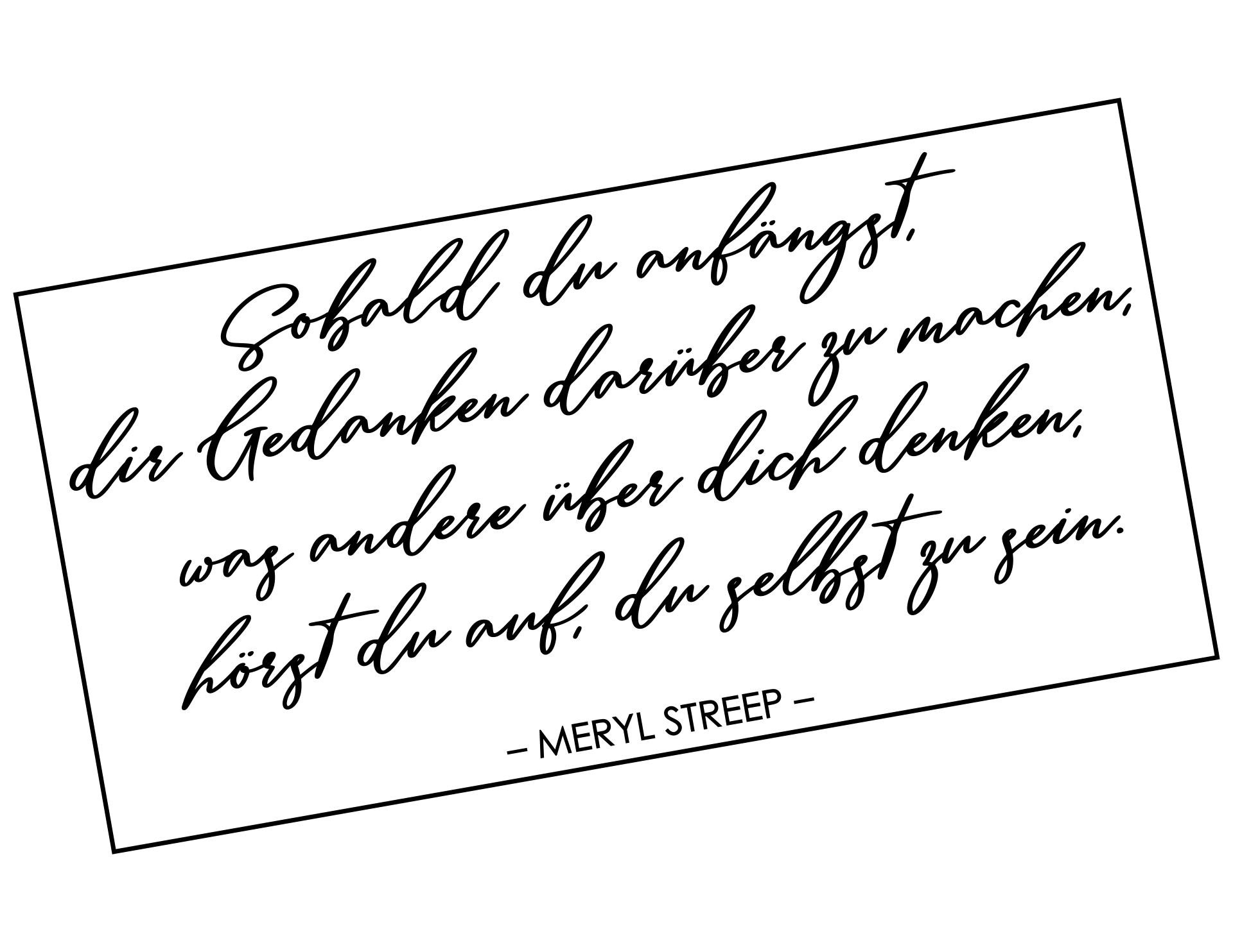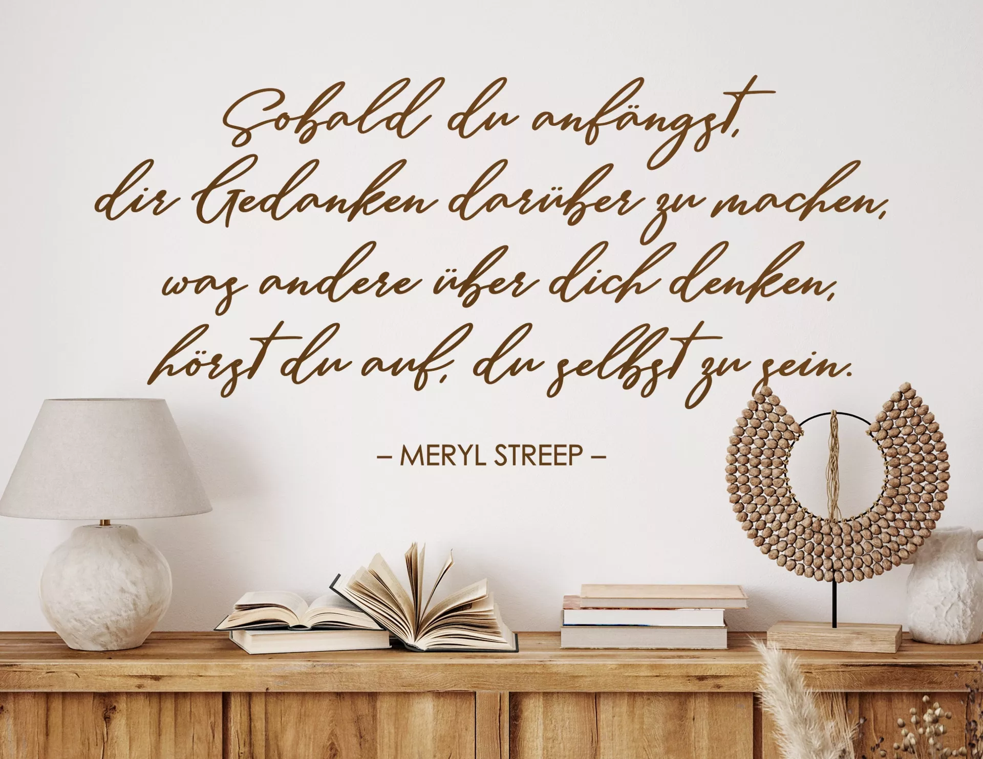 Meryl Streep hat nicht nur in Blockbustern wie "Der Teufel trägt Prada", "Jenseits von Afrika" und "Die eiserne Lady" mitgespielt, sondern sogar den Oscar als beste Schauspielerin gewonnen – drei Mal! Als Star von Welt bekommt dieses Wandtattoo-Zitat von 'Meryl Streep' natürlich ein großes Gewicht: "Sobald Du anfängst, Dir Gedanken darüber zu machen, was andere über Dich denken, hörst Du auf, Du selbst zu sein." In diesem Sinne bleiben wir authentisch und ehrlich, und verzichten auf ständiges Nachdenken, was andere von uns halten. Eine Dekoration, die uns an die wichtigen Dinge des Lebens erinnert – und damit bestimmt ein Stück glücklicher macht.