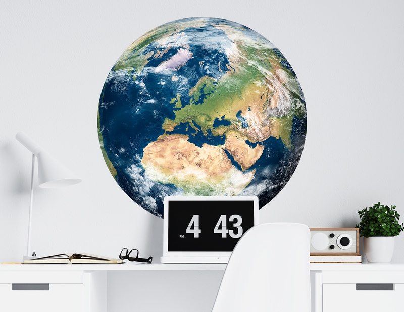 Eine Aussicht wie aus dem Space Shuttle: Unser Wandtattoo Planet Earth. Länder, Kontinente, Bergketten, Wüsten, Wälder, Flüsse und Ozeane – das kartografische Weltkugel-Design in 3D Optik zeigt in satten Farben Teile der Erde von Afrika, Europa, Asien, Amerika und der Arktis.
