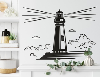 Turm in der Brandung: Ein Leuchtturm an der Küste, mit Wolken im Hintergrund und den angedeuteten Lichtstrahlen als Navigationshilfe für vorbeifahrende Schiffe. Diese schöne maritime Dekoration wirkt als Wandtattoo malerisch und sehnsüchtig zugleich.