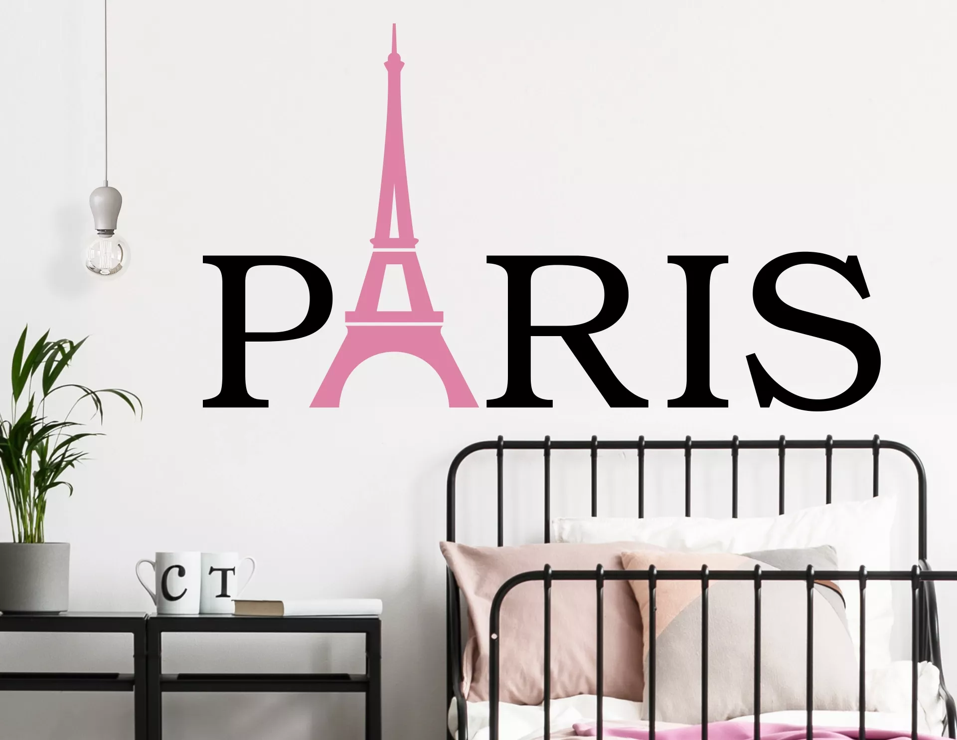 Das Wandtattoo „Paris City-Name“ integriert spielerisch den Eiffelturm in den Schriftzug der französischen Hauptstadt.