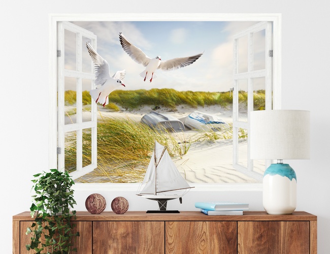Wer nicht so schnell ans Wasser kommt, dem hilft unser maritimes "3D Wandtattoo Ausflug ans Meer". Es weckt die Vorfreude auf den nächsten Urlaub am Strand, mit einem Blick durchs Fenster auf eine schöne Deichlandschaft.