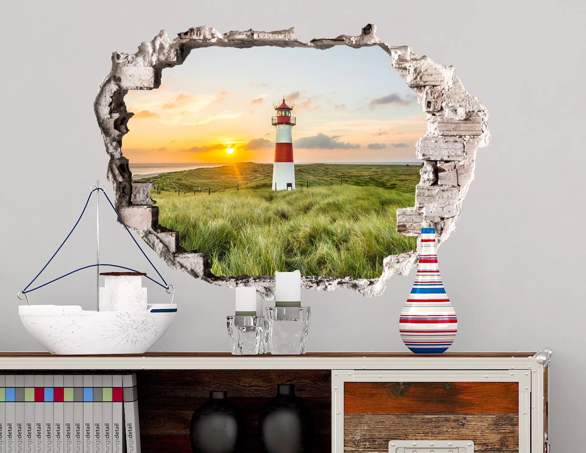 Wandtattoo "3D Wandtattoo Leuchtturm": Ein maritimes Design mit einem rot-weiß gestreiften 'Wächter der See', im Mauerwerk-Rahmen samt Sonnenuntergang und grünem Deichland am Meer.