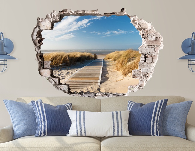 Jetzt am Meer sein? Das wär' doch was! Weißer warmer Sand, Sonnenschein, der Duft von Dünengräsern, barfuß über den Holzsteg laufen und rein ins Wasser. Wandtattoo "3D Wandtattoo Meeresdüne": Ein maritimes Design mit Küsten-Feeling, im realistischen Mauerwerk-Rahmen samt blauem Himmel, viel Schilf und schäumenden Wellen am Sandstrand.