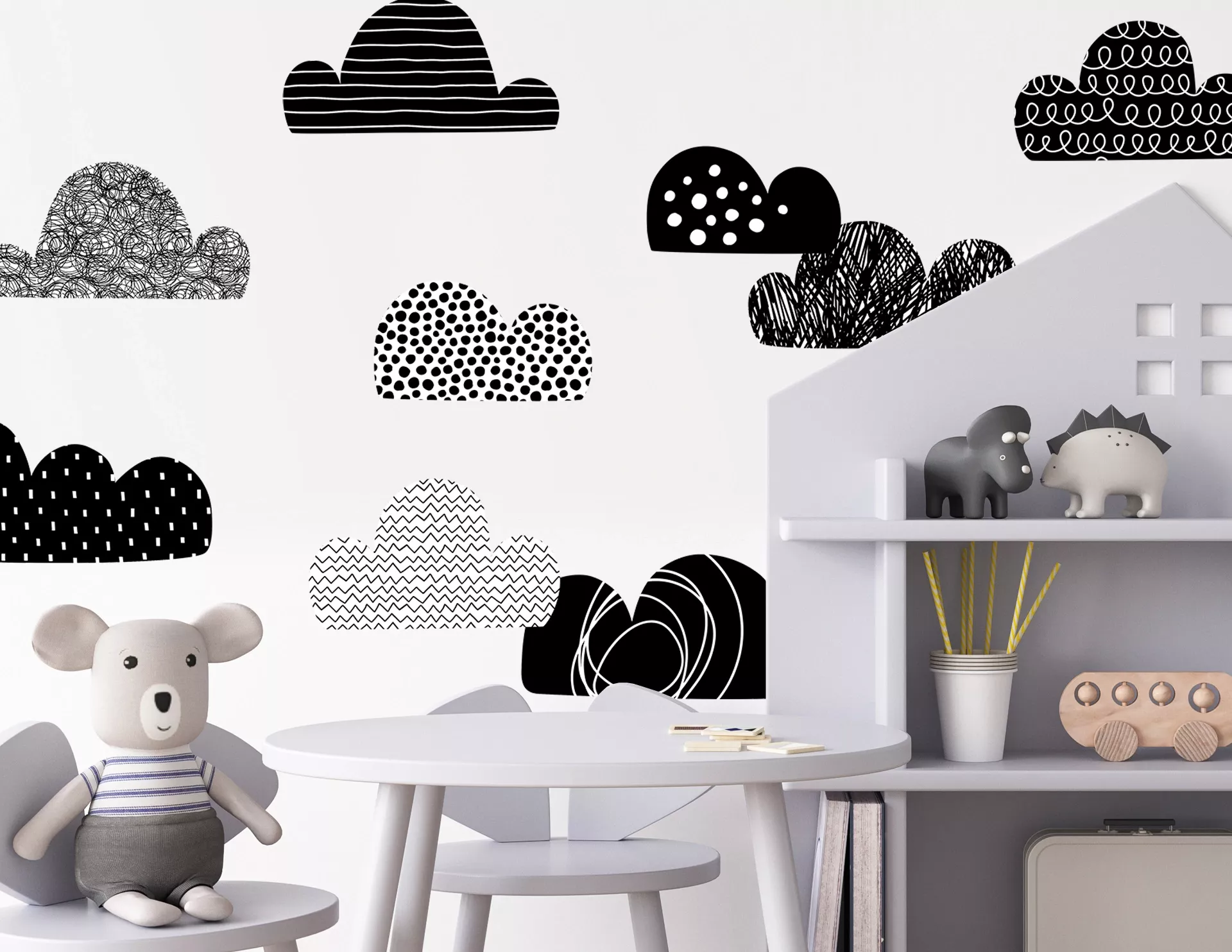 Wandtattoo "Black Clouds": Ein handgezeichnetes Artwork mit neun schwarz-weißen Wolken, welche sich frei an der Wand platzieren lassen und z.B. perfekt ins Kinderzimmer oder die Spielecke passen.