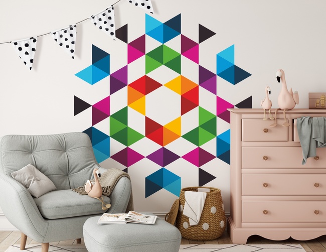 Wandtattoo Buntes Kaleidoskop: Ein grafisches Kunstwerk, bestehend aus vielen Dreiecken in Mandala-Anordnung, für Freude & gute Wohn-Vibes in jedem Raum.