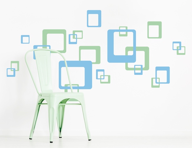Poppige Wandkunst im trendigen Retro-Style: Wandtattoo „Retro Squares“, im Set mit 22 Quadraten. Farben, Tapeten und Möbel im Retro-Look sind Kult.