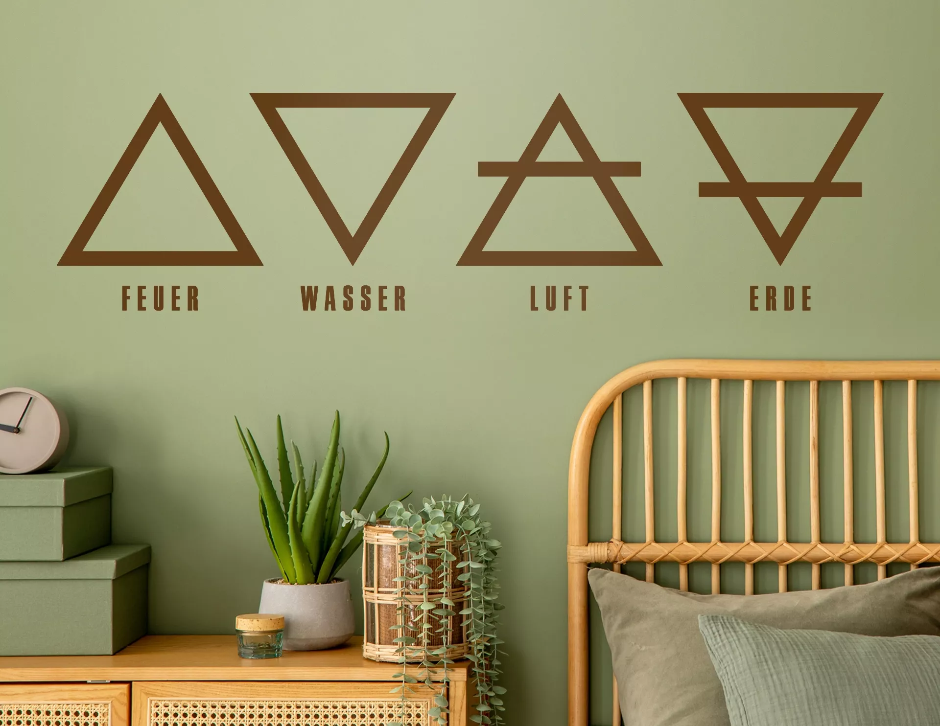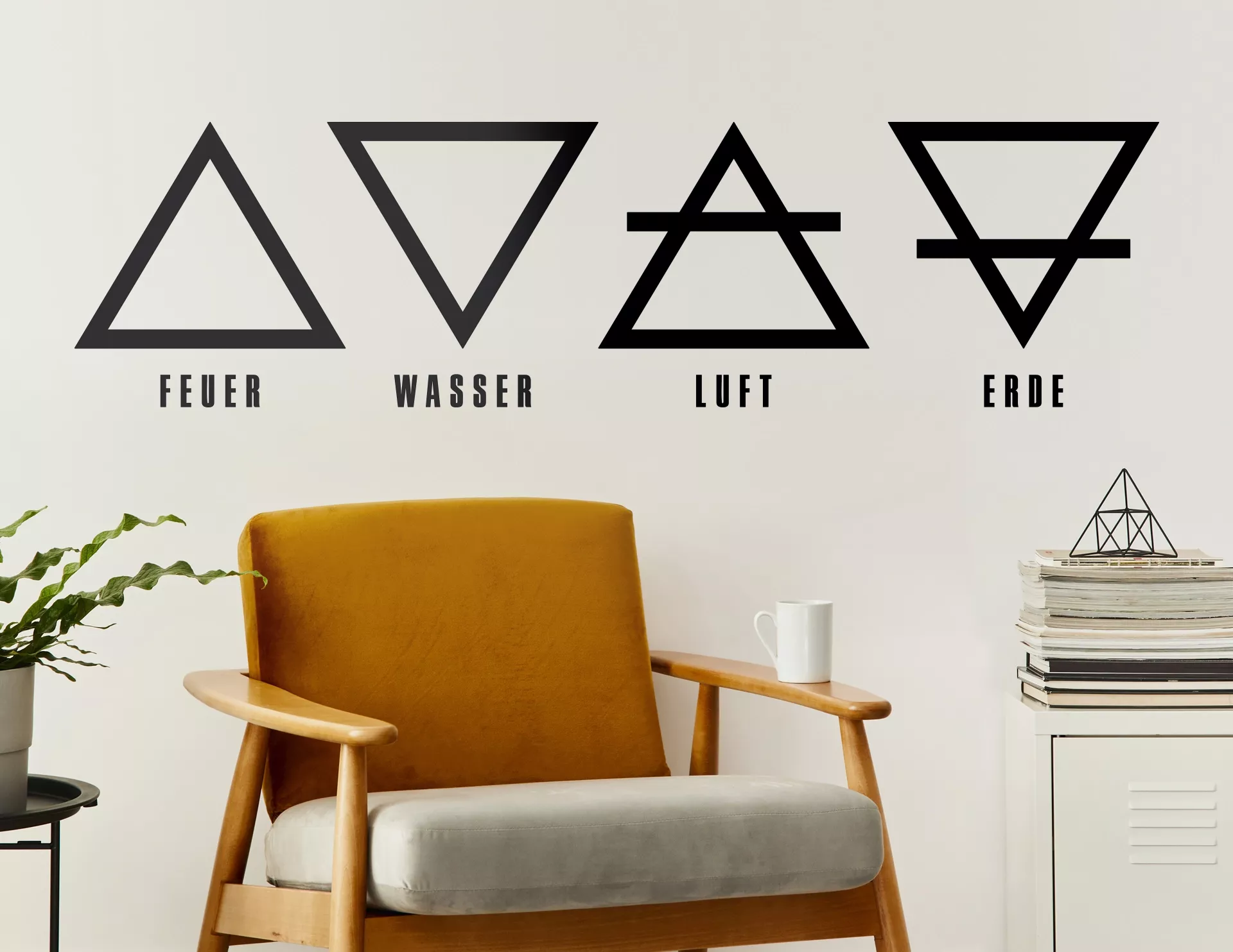 Woraus besteht die Welt? Sie bestimmen das Leben auf unserem Planeten: 'Die vier Elemente'. Ohne Feuer, Wasser, Luft und Erde wäre kein Leben möglich. Das wussten schon die alten Griechen und hielten diese vier Urstoffe für die Bausteine unserer Welt… Und dass man diese Dreieck-Symbole aus der Alchemie auch zum Dekorieren verwenden kann, sieht man an diesem Wandtattoo. Die geometrischen Formen haben außerdem etwas Magisches an sich und symbolisieren gleichermaßen die Balance und den Kreislauf im Universum. Nicht nur für Esoterik-Fans ein attraktives Motiv!