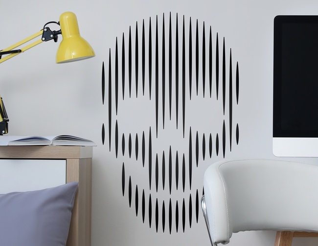 Eine schaurig schöne Linien-Grafik samt optischem Täuschungseffekt zum Aufkleben – für all jene, die Horrorfilme lieben, Halloween-Fan sind oder dem morbiden Charme des Sensenmanns nicht widerstehen können – Wandtattoo "Skullusion"!
