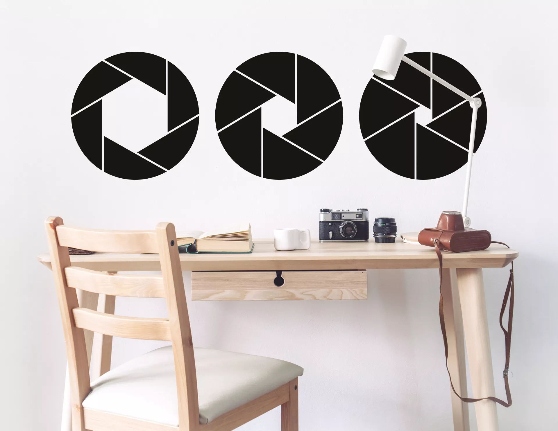 Das Wandtattoo „Verschlusszeiten“ ist eine hippe und kreative Wanddekoration z.B. für das Home-Office. Sag Cheese! So bekommst Du sie alle zum Lächeln. Mit diesem originellen Design-Set bestehend aus drei Verschlusszeiten einer Photo-Kamera, dargestellt im graphischen Look, bist Du ganz up to date. Kennzeichne somit ganz klar Deinen eigenen Lebens- und Arbeitsbereich. Eine Wandverschönerung die die Blicke auf sich ziehen wird und für eine erfrischende Raumatmosphäre in Deinem Heim sorgt!