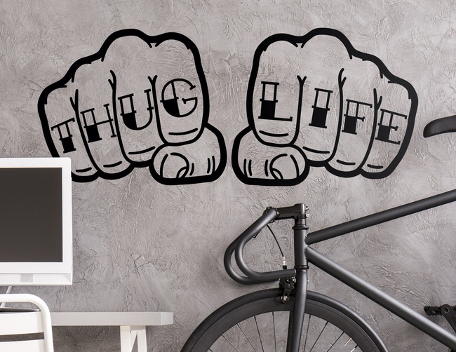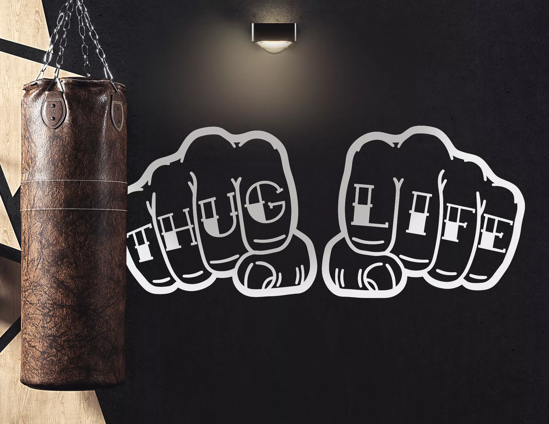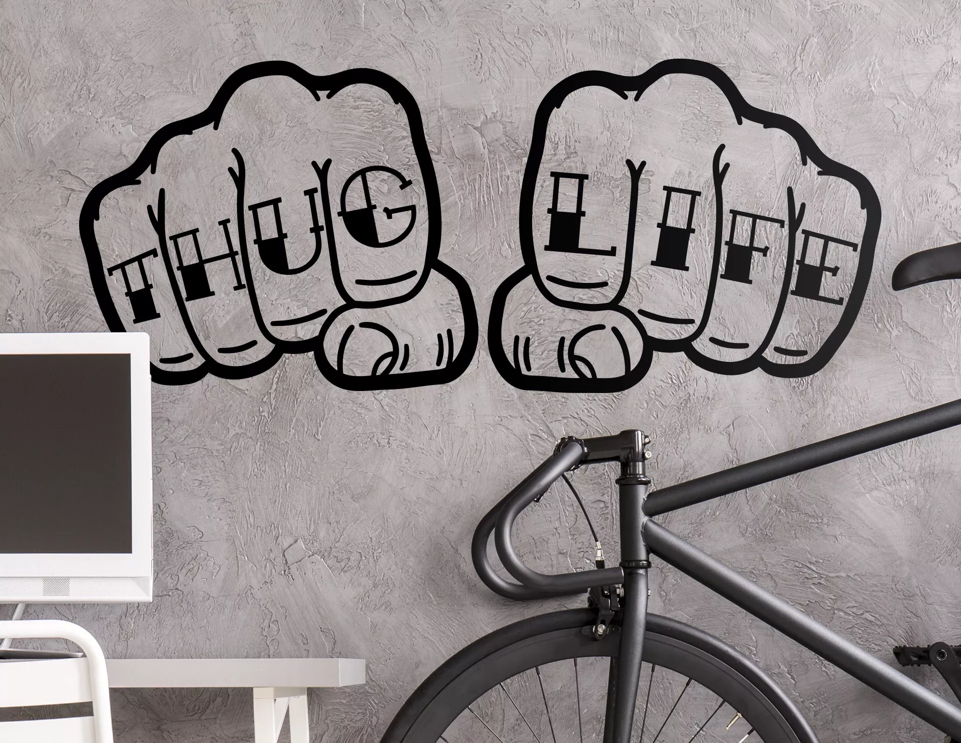 Für alle Thugs da draußen gibts diesen ikonischen Wandsticker, der zwei ausgestreckte Fäuste zeigt. Auf die Finger sind groß die Buchstaben THUG LIFE tätowiert, die übersetzt sinngemäß Gangster/Schläger -Leben bedeuten.