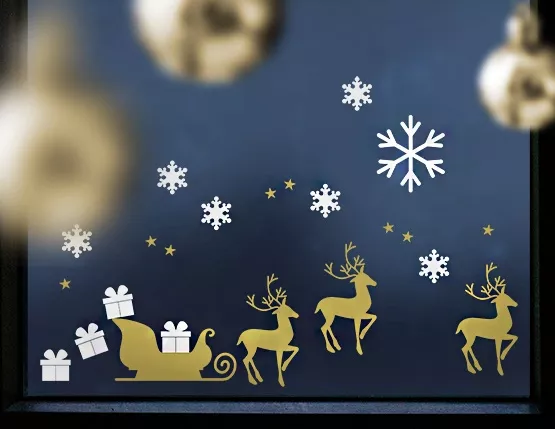 Festlich dekorieren zur Weihnachtszeit: Das Wandtattoo Rentierschlitten umfasst drei Rentiere, einen Schlitten, vier Geschenke und fünf Eissterne.